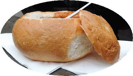 マーケットで珍しい大きなパンの中にスープが入り、パンを崩して食べていくのですが、そのパンを |