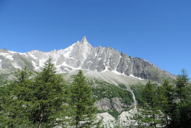 | 圧倒されます。正面にはアルプス3大北壁のひとつグランド・ジョラス北壁が屏風のように立ちふさがっています。 | |