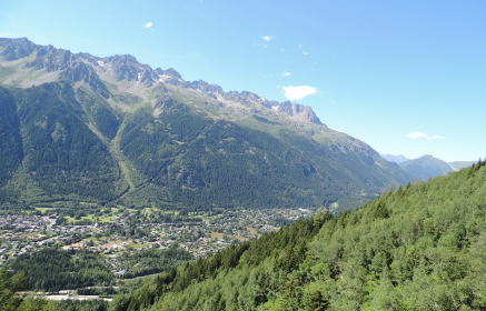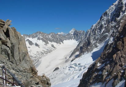 | 日当りのいい展望台でシャモニの町を眼下にモンブランやシャモニ針峰群が綺麗に見えます。モンブランから流れ出すボソン氷河、 | |