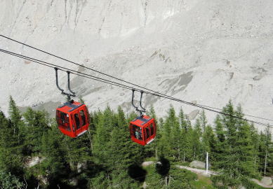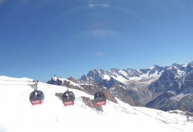 | モンブラン・パノラミック・テレキャビン 3連ロープウエイに乗って空中散歩です。イタリアのエルブロンネに向かいます。 | |