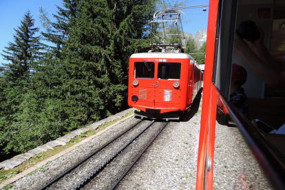 | タイミング良くすぐに出発です。ガタゴトと走ります。反対側にラックブランのある山々が見えます。山の中を走ります。 | |