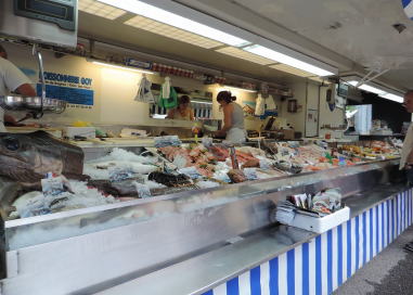 | モンブランでは土曜日には市がたちます。地元の人がお店を出します。お魚、ハム、野菜、果物、ワイン、洋服や | |