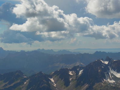 | 頂上から見るモンブランも近くに見えます。ドリュ、エギュイ、ヴェルト、シャモニー針峰群、のパノラマは壮観です。 | |