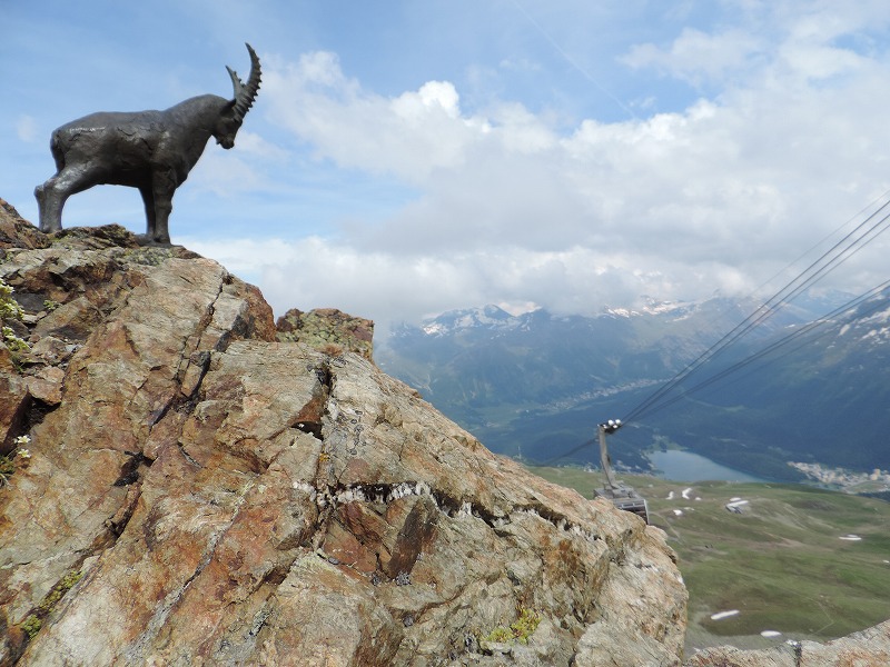 | 途中コルヴィリアからゴンドラに乗りピッツ・ネイル頂上へここにはサンモリッツにいつも出てくる大きなシュタインボックの | ||