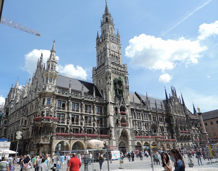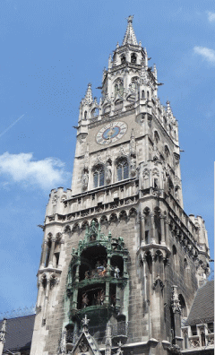 | ドイツ最大の仕掛け時計で知られるネオゴシック様式の新市庁舎は、毎日11時・12時・17時に音楽が鳴り出し、 | ||
