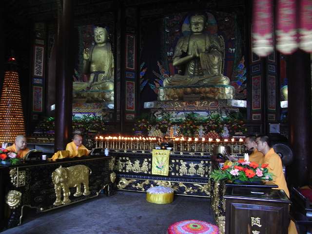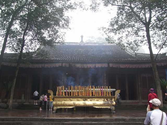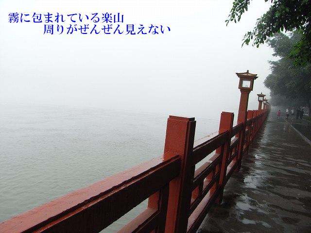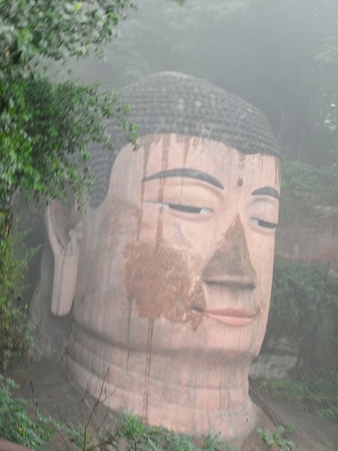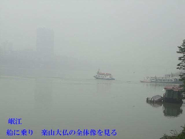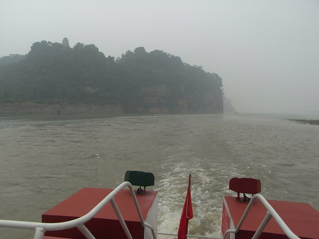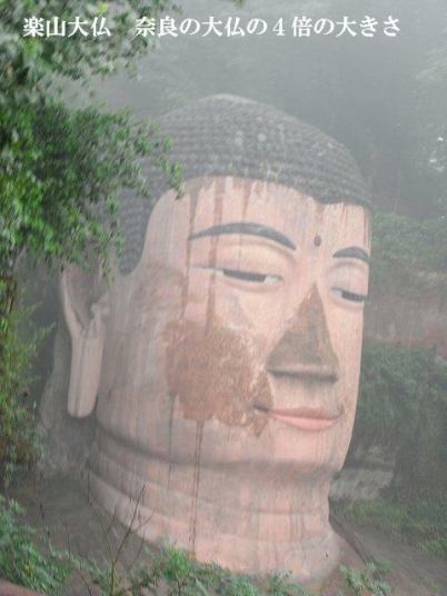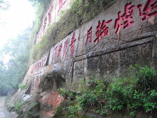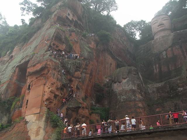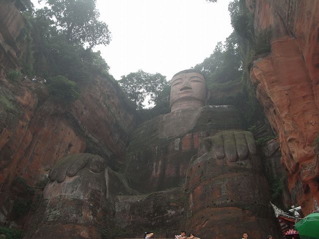 | 観光が始まります。成都の町は霧で先が見えにくくなっています。1年のうち330日がこのような天気だそうです。(墨絵の世界) このような日々が続くと心が暗くなってしまいそう? 楽山に着いても霧で見えない。 先に凌雲寺を見学 禅宗寺院で、別名大仏寺と呼ばれている。 建立は唐代までさかのぼるが、現在の建築は明、清代に再建されたもの、そこから望む岷江の眺めは美しく、古くから景勝地として名高く、多くの詩人たちが訪れて、詩に詠みこまれている。 岩山の歩道を歩いていくと、岩に彫られた大きな文字が、たくさん彫られている。大仏の顔のところに出る。 やさしい大きな顔にびっくり。 楽山大仏は岷江に臨む梄鸞峰の岸壁に掘られた世界最大の石刻座仏でユネスコ世界遺産にに登録される。高さ71m、肩幅28m、頭部の高さ14m、頭部の直径10mという巨大さだ。足の甲には大人100人が余裕で座ることが出来るという驚きだ? 岷江の氾濫や水害を鎮めるために造られた。 実に90年の歳月を要した。そして1200年経った今でも岷江の流れを静かに見守り続けている。 船に乗り巨大な大仏の全体を見るために、まだ霧にかかった岷江をクルーズ、 |