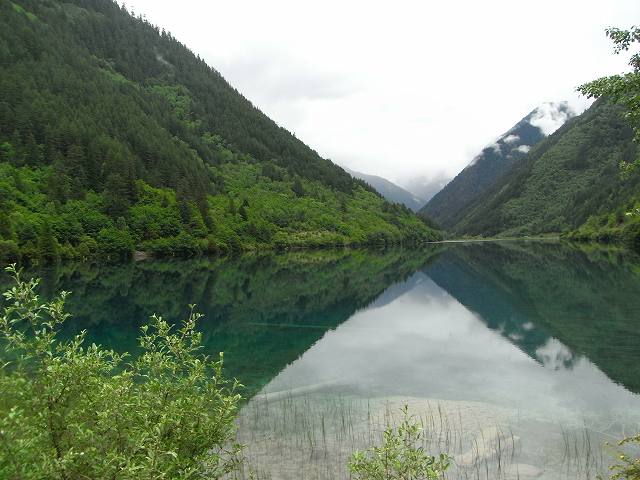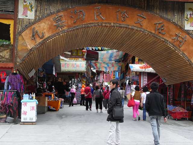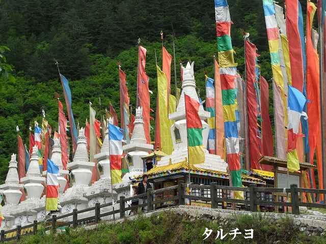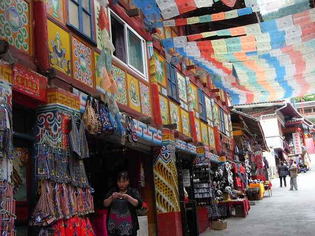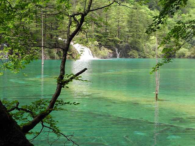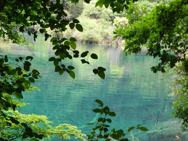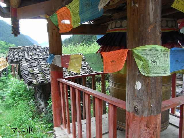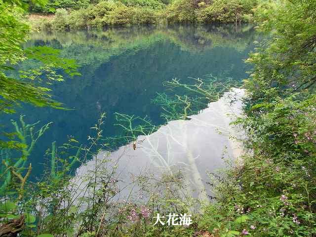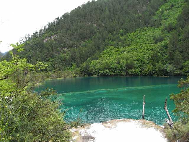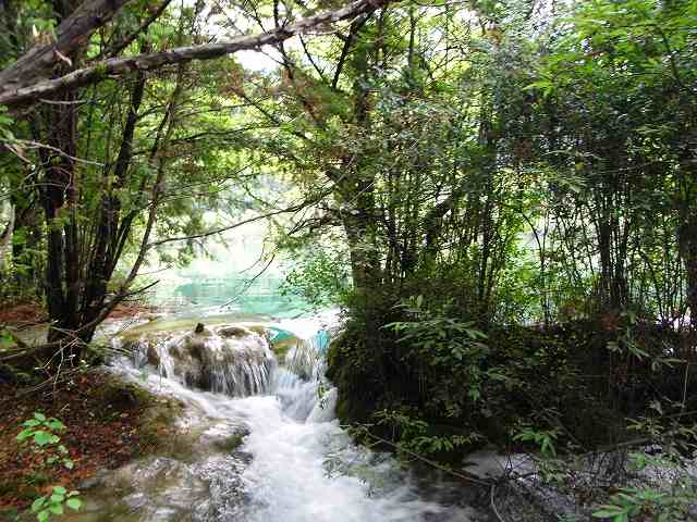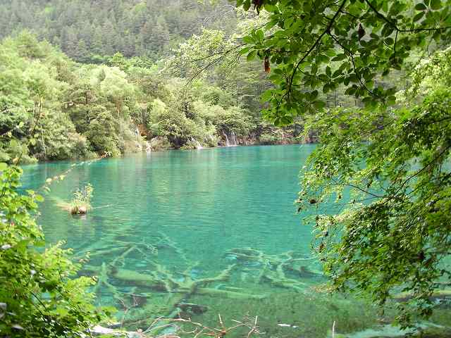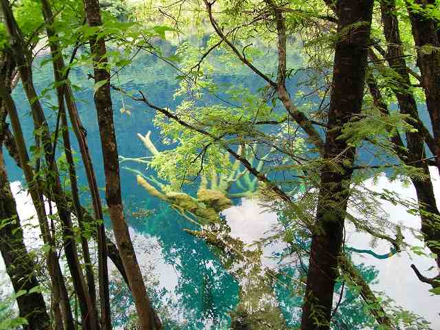 | 全長2kmの長さを持つ九寨溝では2番目に大きな湖、年間を通して水量が同じで、湖から流れ出した小川に水車があって水力を利用して回っている。 マニ車はチベット仏教の祈り、1回転すると経文を読んだことになる。そしてく功徳が頂けるという。 湖面にはもたくさんの葦が生え、 うっそうとした樹林や滝などがある。1ヶ所で最も多彩な風景が見られる。 散策をしていると美しいエメラルドグリーンの五花海 九寨溝の中でも最も美しいといわれている海子。 浅い湖底には乳白色のなった倒木が横たわり、青い湖水とマッチして幻想的な雰囲気を醸しだしている。 民族文化村はカラフルなチベット模様の書かれた壁、中はお土産屋さんがずらりと並んでいる。 華やかな店先には店員が呼び込んでいる。 |