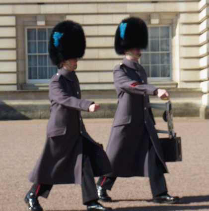 (この時期はコートを着ています)近衛兵たちは直立不動のりりしい姿で女王陛下をお護りしている。 |