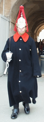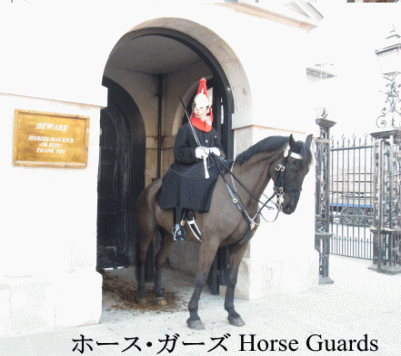 門衛は、これぞイギリスのいでたち騎兵隊は、この赤い軍服のライフ・ガーズ。ここでも近衛兵の交替式が |