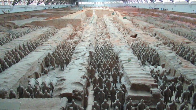中国初の皇帝、始皇帝の陵墓を守るための副葬品として製作された兵士や軍馬の等身大の素焼き陶器。 |
