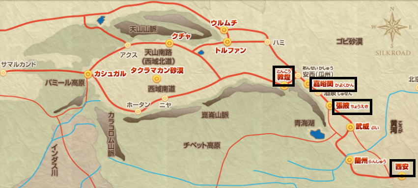 物資ばかりでなく、宗教、思想、芸術などもここを通る人々によって伝えられ、シルクロードは東西文化の交流の道と |