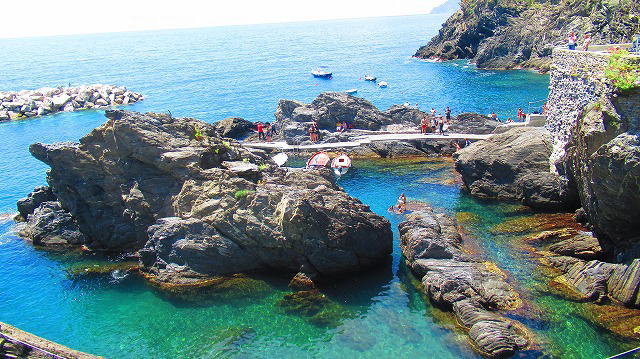 鉄道駅にも近く、海岸沿いのトンネルを抜けると、中央広場です。お土産屋さんが充実、 ここでワインを買ってホテルのあるリオマッジョーレ駅まで |
