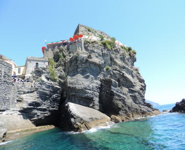 | 海から望むヴェルナッツァの光景 岩の上に建っているお店 |