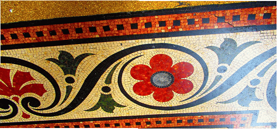| 細かいモザイク画で歩道が埋まっています。今までにたくさんのモザイクを見ましたが歩道に使っているのには驚きです。 | ||