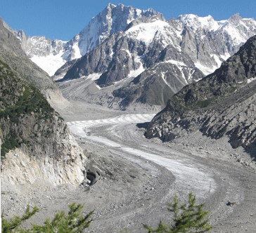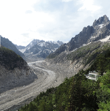 | やはり、ここでも氷河が溶けているようです。いろいろな展望台、素晴らしいモンブランを囲む針峰群 | ||