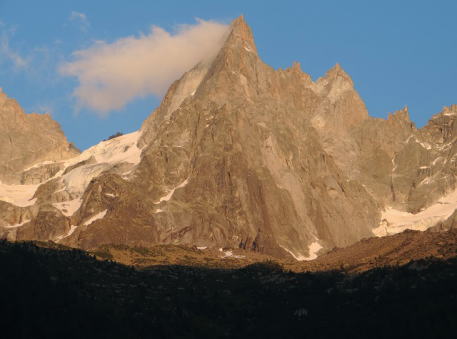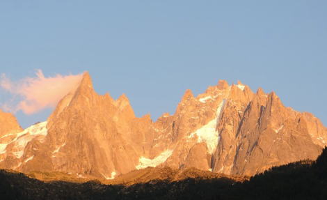 | アルプスの最高峰モンブランは優雅な稜線で知られています。それを取り巻く山群は対照的に切り立った針峰群が多いです。 | ||