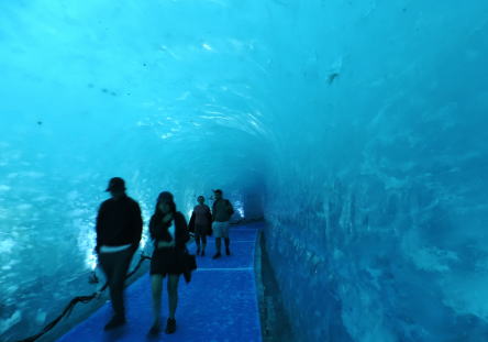 | リフトの終点から階段で 下ります。なかなか着きません。氷の洞窟は今までとは違い洞窟が短くなったようです。展示物も少なく感じました。 | ||