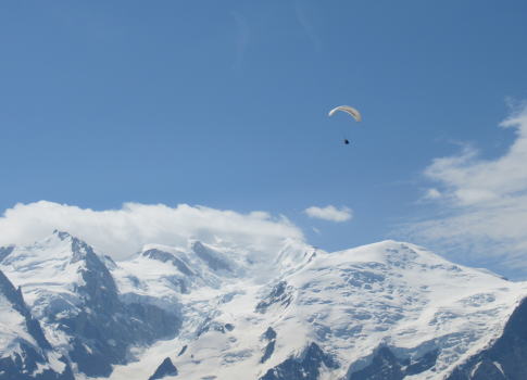 | モンブラン4810mが雲一つない素晴らしい天気の中はっきりと見えます。それに連なるシャモニー針峰群も綺麗に見えます。 | ||