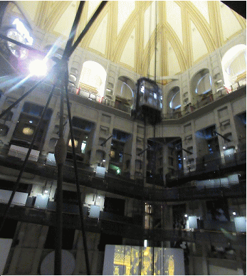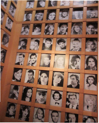 | 昔、活躍した人たちの写真が 壁に飾ってありました。建物の真ん中に透明なガラス張りのエレベーターがあり宙づりになって屋上へと昇っていきます。 | ||