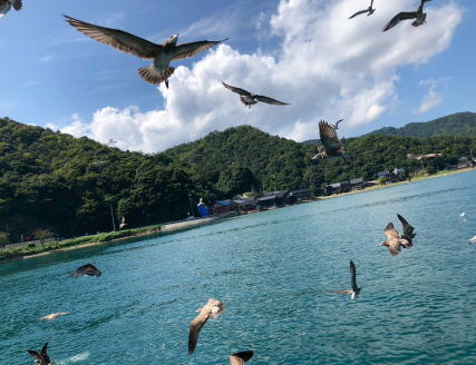 早速、伊根湾めぐり遊覧船に乗りました。海鳥たちが周りにたくさんいます。餌をあげるので集まってきます。 |