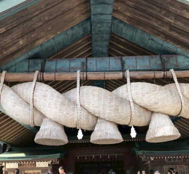 | 壮大な御神殿 大しめ縄13,6m、重さ5,2トン、胴回り最大8m |