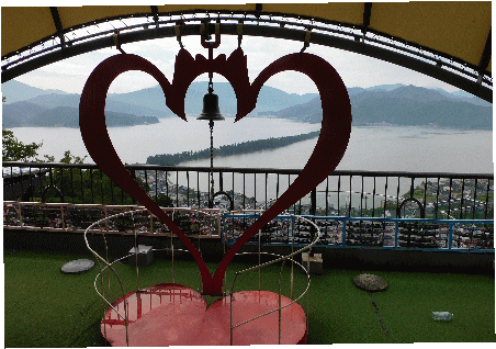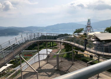 山頂は子供たちが楽しめる遊園地がありました。飛龍観展望、股のぞき、素晴らしい景観を楽しみました。 |