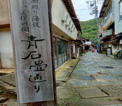 青石畳通り 美保神社の参道から横に伸びる250mの石畳み、沿道には老舗旅館などが軒を連ねています。 |