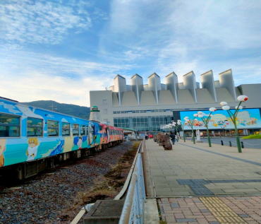 駅には大きな鬼太郎の絵を描いた看板や、ちょうど電車が到着しました。ここにも鬼太郎の絵で埋め尽くされておりました。 |