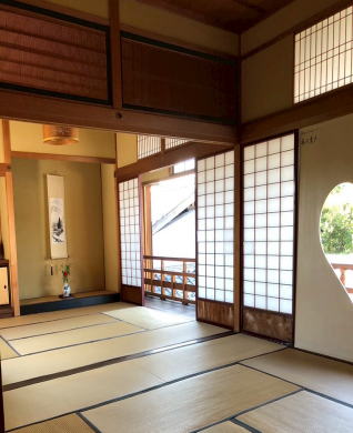 母屋は築134年で児に登録有形文化財です。母屋の空間である土間は、居間と一体化した吹き抜けになっています。 |