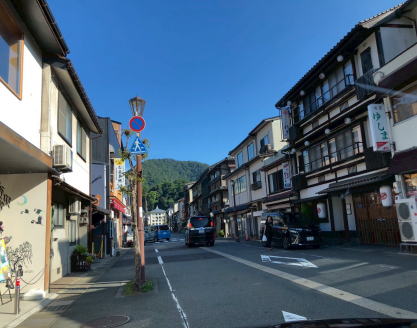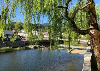 帰りに街の中を車で通り、川べりに揺れる柳、趣のある建物や温泉らしい風情をかもし出しています。 |