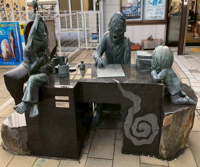 駅前には 執筆中の水木しげる先生の机の周りには鬼太郎たちのブロンズ像がありました。 |