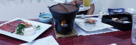 ここでは時間がなく泊まるだけでした。但馬牛、ズワイカニの懐石料理です。赤ワインをとり楽しみました。 |