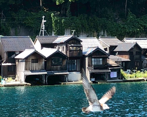 そこに大鷲もいます。舟が動くのを追いかけてきます。舟屋もたくさん並んでいます。 綺麗な海を身ながら楽しみました。 |