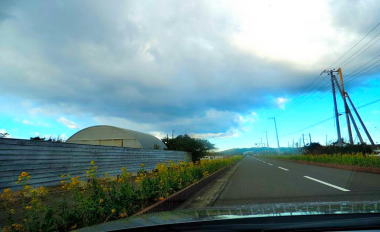 | 湾を走ります。道の両側に菜の花が咲いています。ここが菜の花ロードです。 | ||