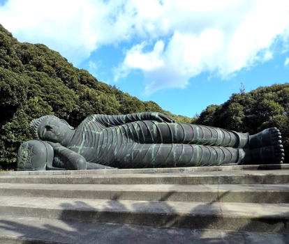 | 太平洋と伊豆諸島を望む高台に、巨大な釈迦涅槃(ねはん)仏が横たわっています。 | ||