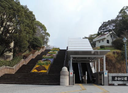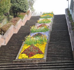 階段にはかわいい花が続いています。とてもかわらしく綺麗です。その脇をエスカレターで上がっていきます。 |