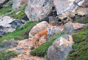 お地蔵様が、信仰の対象となっているのでしょう。 可愛いキタキツネが現れました。逃げる様子もなくゆっくりとしていました。 |