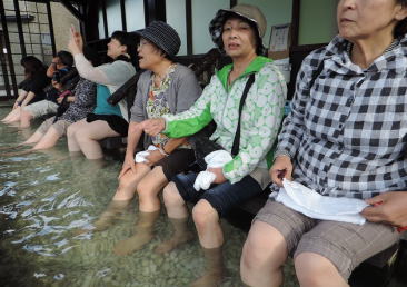 約10分ごとに15m以上の高さまで噴き上がります。噴きあがった間歇泉を足湯に流しています。足湯につかりながら待ちます。 |