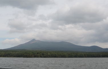 遊覧船に乗り景観を楽しみました。最初に眼に入ったのは綺麗に横たわる駒ケ岳です。駒ケ岳とは 駒と馬のこと。 |