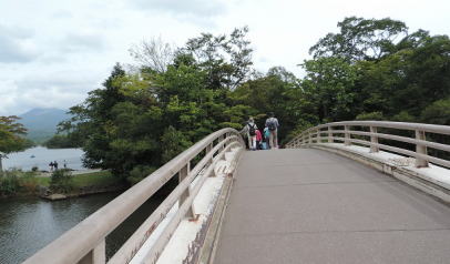 すべての小島はアーチ状の橋でつながっています。駒ケ岳を見ながら歩きます。もうすぐ 変わる季節にちらほら葉の色が |