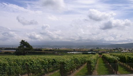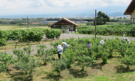 | 丘の上に広がるブドウ畑、雄大な景色を楽しみながら 大勢の人たちがブルーべリーを一粒ずつ積んでいました。 | ||