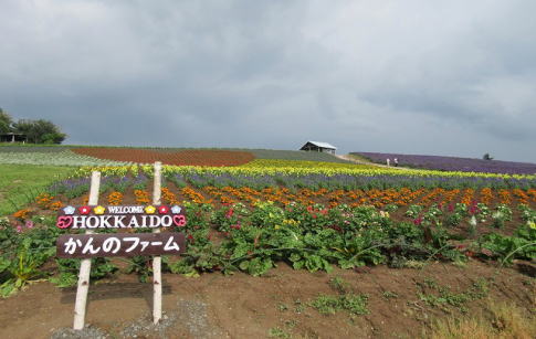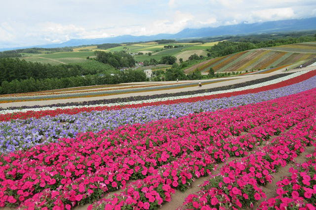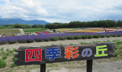 | 旭岳や十勝岳連峰などの迫力ある大自然を背景にラベンダーやひまわりなどの花畑を眺めることが出来ます。、 | ||