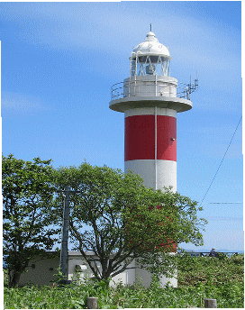| 湯沸岬灯台(霧多布岬のこと) 白地に赤横帯の入った四角形の大型灯台、実行光度は82万カンデラです。 | ||