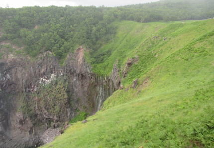 | この滝は川がなく知床連山に降った雪と雨が地下に浸透し、垂直に切り立った断崖約100m、割れ目から流れ落ちています。 | ||