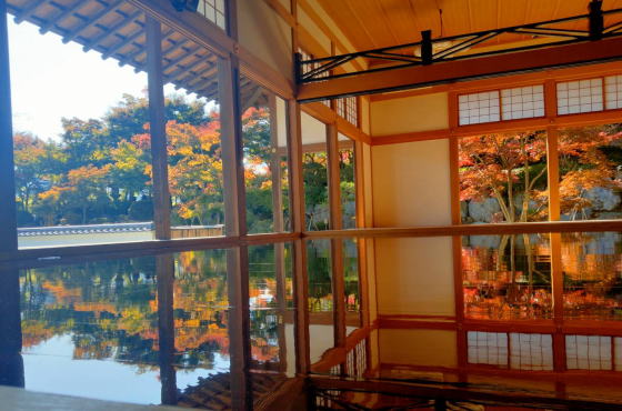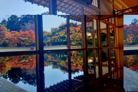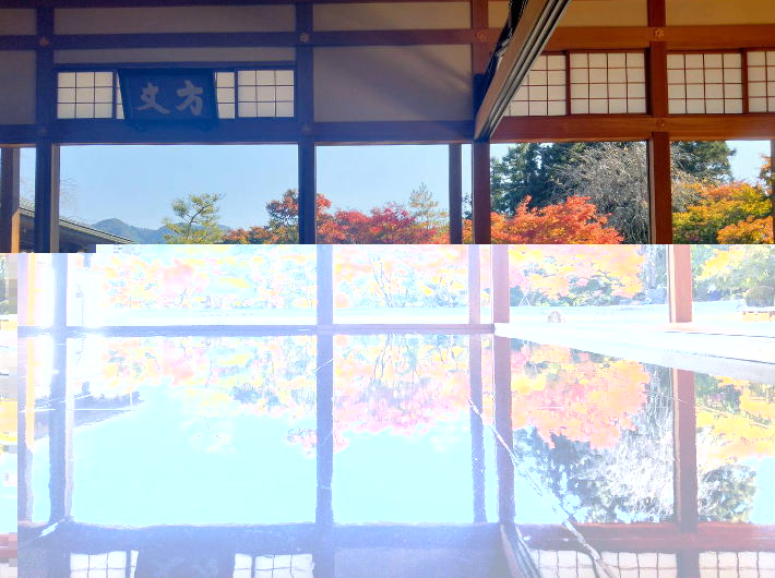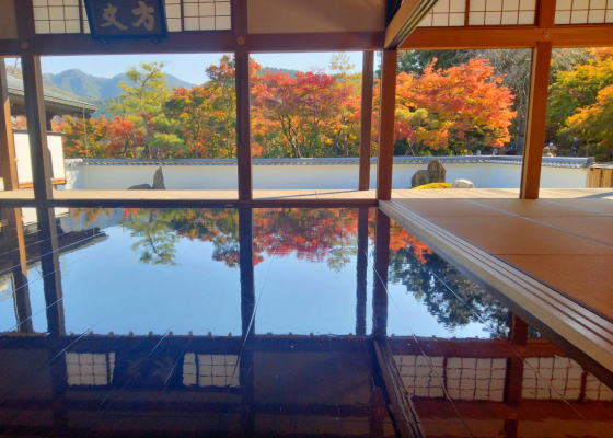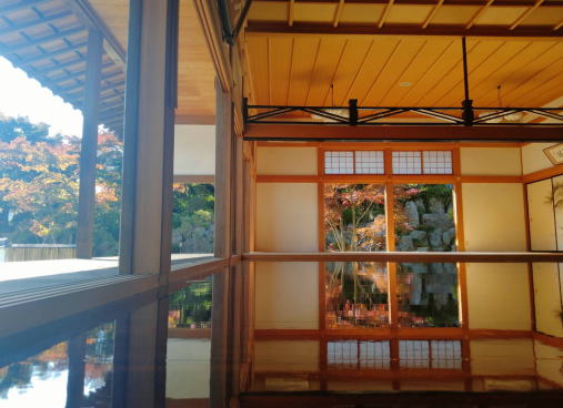 本堂に入り仏様にお参りをしてからの見学です。綺麗に紅葉した樹木が床に移り、一枚の絵のように見えます。 |