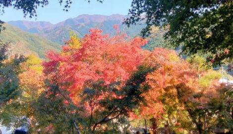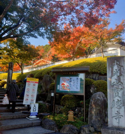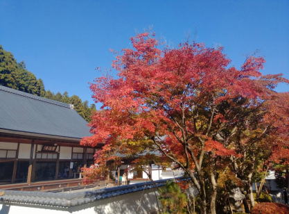 山々に囲まれた宝徳寺は境内には100本以上のもみじが紅葉に季節を迎えました。紅葉が本堂の床に移り、 |