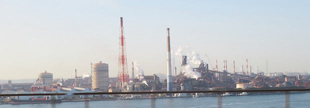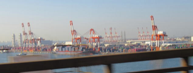 ここは前に来たことのあるパーキングでした。四日市工場地帯は大きな貨物船、大きな煙突から煙を出しています。 |