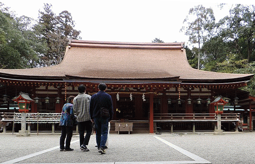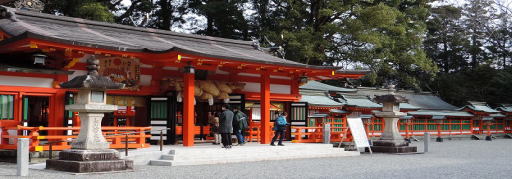 桜門を入り、国宝の拝殿の正面で参拝をしました。綺麗な朱塗りの神社です。 |