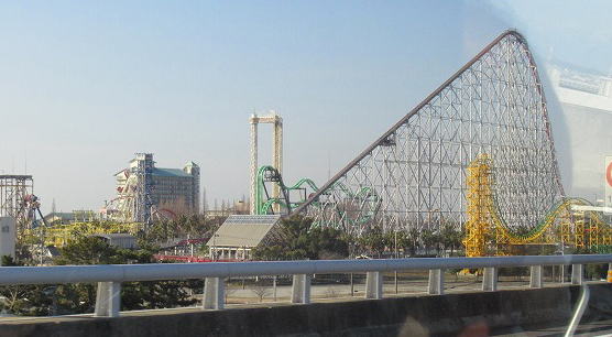 海沿いを長い距離が続いています。 よくテレビで見るナガシマスパーランドの巨大なマシンが並んでいます。見ただけでも怖いです。 |
