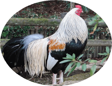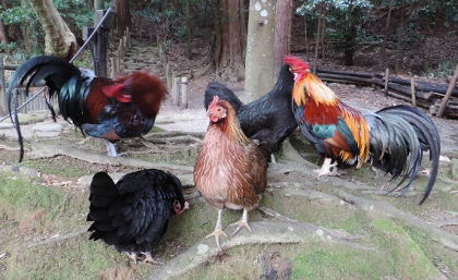 大鳥居から歩いて行きます。周りには大きなチャボの鳥が多くおります?なぜ、鶏がいるのか? |